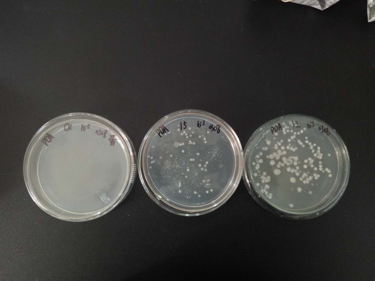 沃土實(shí)驗(yàn)室對(duì)前期寄送的樣品進(jìn)行了多項(xiàng)指標(biāo)的測定,并進(jìn)行了菌劑接種和保存試驗(yàn)。試驗(yàn)基質(zhì)中接種了沃土的15個(gè)菌種,經(jīng)過30℃的恒溫培養(yǎng),1天后均繁殖出了菌落,其中尤以接種9號(hào)、10號(hào)和12號(hào)菌種的培養(yǎng)基質(zhì)菌落數(shù)量最多,而對(duì)照組(未接種菌劑)的基質(zhì)中沒有菌落出現(xiàn)。
